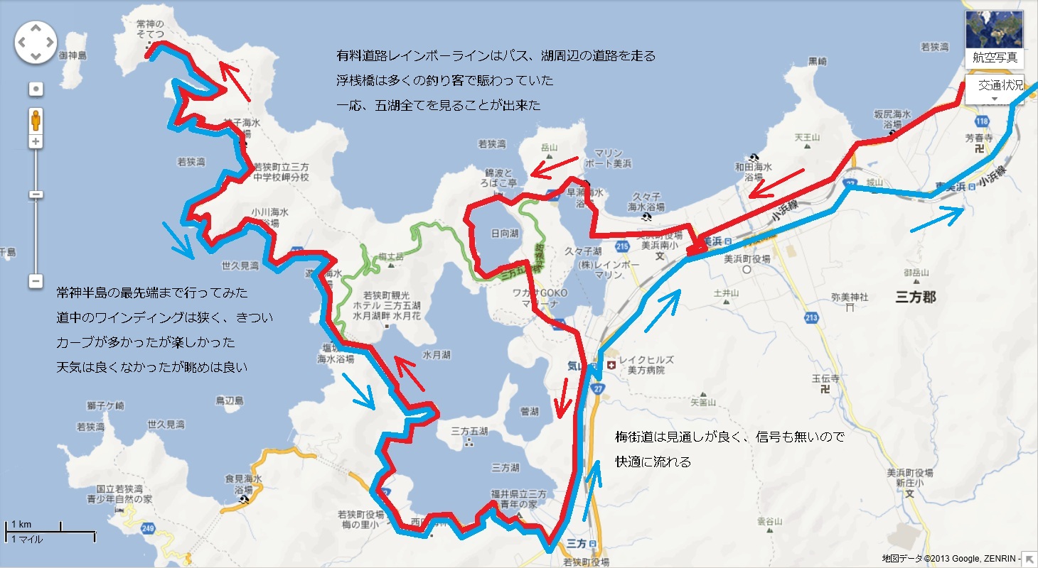国道162号に接続し北上、三方湖、水月湖の湖畔を走る。