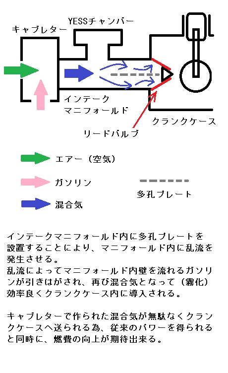 多孔プレートによって乱流が発生し、内壁を流れるガソリンが引きはがされ再び混合気となってクランクケース内に導入される仕組み。