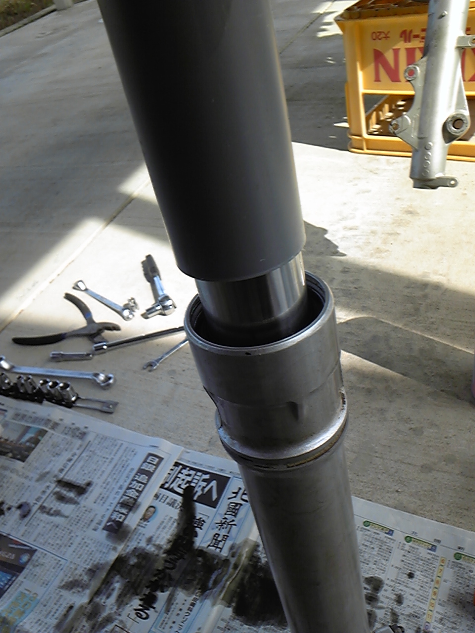 そしてフォークを伸縮させてみると・・・オイルシールの隙間に薄いビニールの様なものが@@