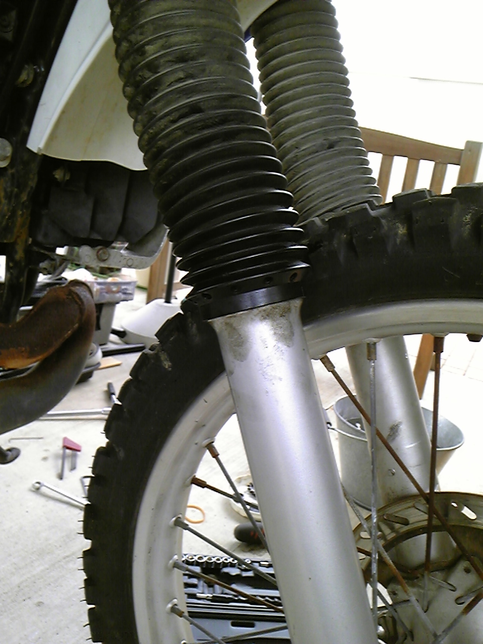 インナーチューブとアウターチューブの間にオイルが溜まっていて、大変なことになっていた><