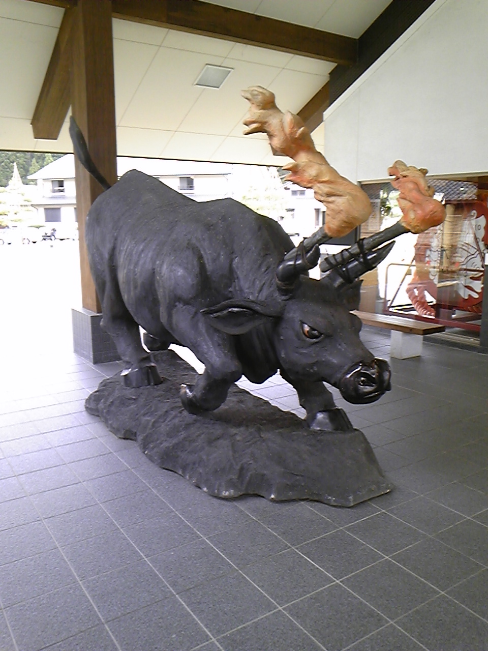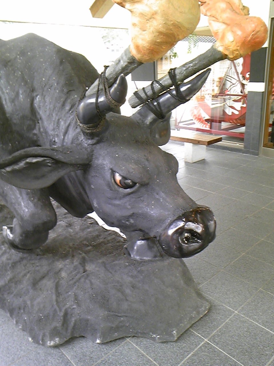 説明によると、1180年に木曾(源)義仲が「倶利伽羅峠」で取ったと伝えられる戦術「火牛の計」らしい。