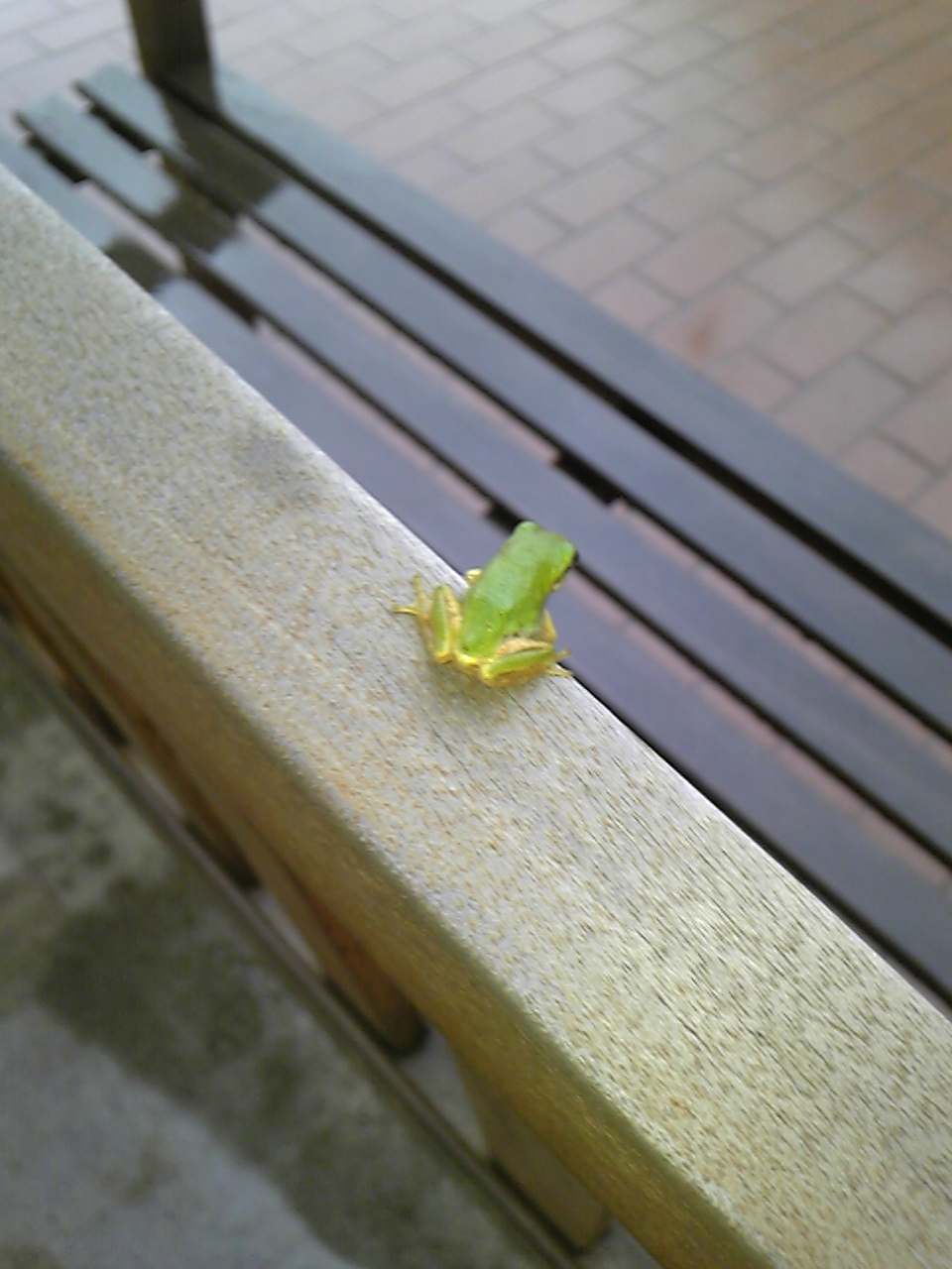 しかし庭先のベンチにいたアマガエルは、まるで雨宿りをしている様だった。